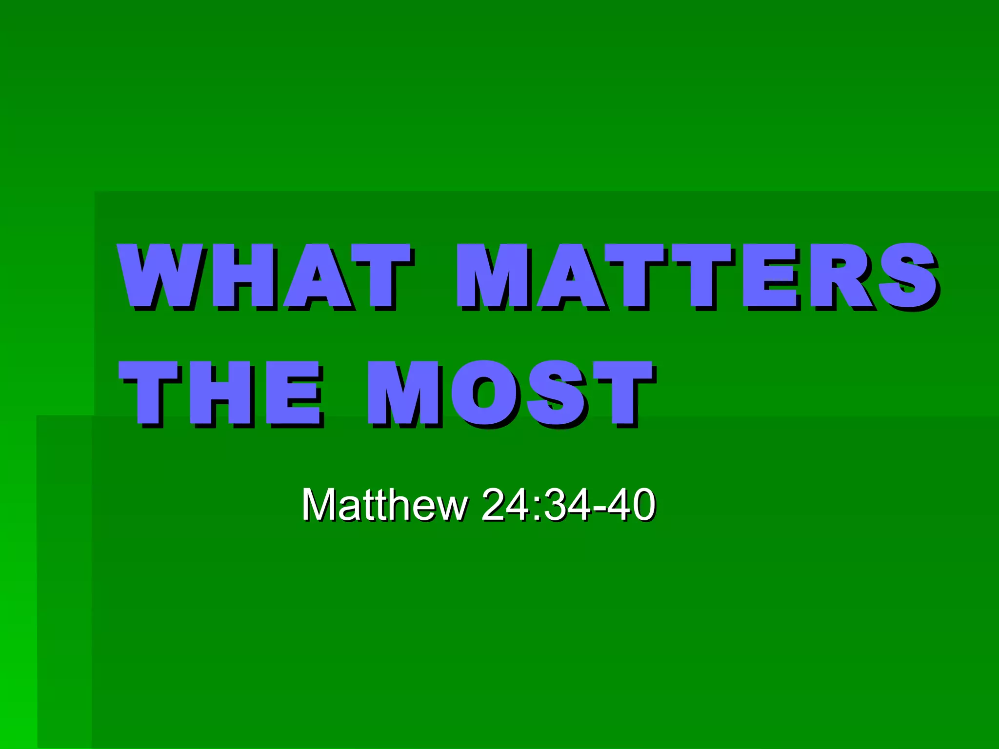 When questioned by Pharisees about the greatest commandment, Jesus responds that the greatest is to love God with all one's heart, soul, and mind. The second greatest commandment is to love your neighbor as yourself. Jesus says that following these two commandments fulfills the whole of Jewish law and prophecy. Loving God means making him the focus of one's entire being. Loving neighbors requires a supernatural ability to feel what others feel and put their needs first, which can only come through living according to the Spirit rather than human nature.