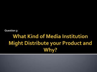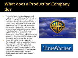 Warner Bros. Pictures would likely distribute the product because they are a major production company within the large media conglomerate TimeWarner, allowing for global distribution. Warner Bros. gains funding from TimeWarner and other investors. They would market the film using TimeWarner's publishing and advertising companies like Entertainment Weekly magazine. The film would likely be released around Halloween to target horror fans, and Warner Bros. could postpone the release date if needed to maximize audiences.