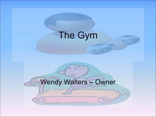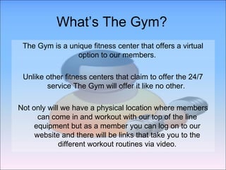 The Gym is a fitness center that offers both in-person and virtual workout options through online videos. It was created for students and employees who wanted to workout but could not make it to the gym at regular hours. Members can track their progress, develop personalized routines with a trainer, and access nutrition plans through an online profile. The Gym provides equipment like a USB-connected scale and calorie tracker, trainer packages, and has staff available most hours to assist members at its Levittown location. It is estimated to turn a profit of over $100,000 in the first year and nearly $390,000 by the third year.