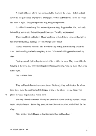 2) Later that night, the dog returns to the alley and finds the old man dead, beaten by three men. He tracks the scent of the men to a park where they are drunk and celebrating.