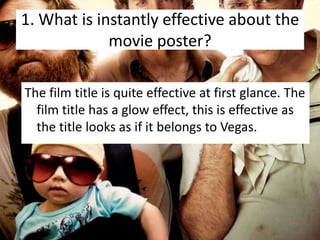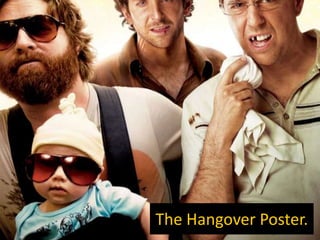 The document analyzes the movie poster for "The Hangover" and how it effectively markets the film. It notes that the glowing title fits with the Vegas setting. The poster conforms to comedy genre conventions by showing an image that hints at the film's content. However, it challenges conventions by using the lit-up Vegas skyline in the background rather than a plain background. The target audience is identified as men and women aged 17 and older, as the missing tooth would appeal to men's interest in violence and Bradley Cooper's presence would appeal to women.