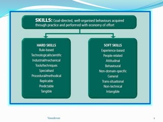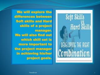 The document explores the differences between soft skills and hard skills for project managers. Soft skills include communication, conflict resolution, and problem solving, which are important for managing people and relationships. Hard skills refer to technical abilities specific to an organization. While hard skills can be taught, soft skills are more difficult to measure. The nature of a project determines whether it requires more soft skills or a balance of soft and hard skills. Both skill sets are important for project managers, though soft skills may be more essential for leadership roles and achieving project goals that rely on teamwork and collaboration.