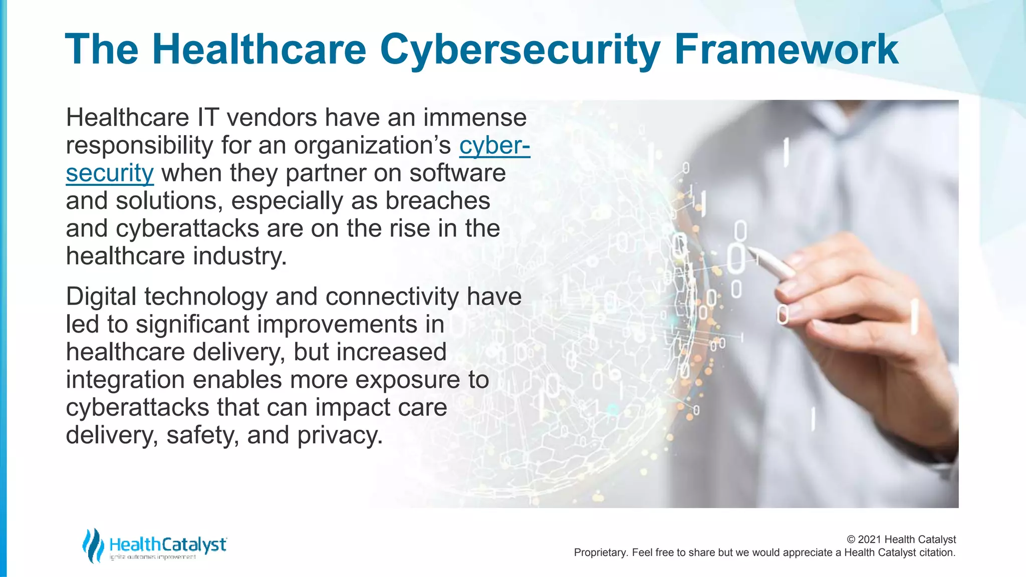 The document discusses the escalating cybersecurity challenges in the healthcare sector, noting that over 93% of healthcare organizations faced data breaches between 2017 and 2020. It emphasizes the importance of a robust cybersecurity framework, highlighting the shared responsibilities between healthcare IT vendors and organizations, and outlines necessary third-party audits and compliance measures to safeguard patient data. Additionally, it underscores the role of C-suite leadership in ensuring effective cybersecurity strategies amidst increasing cyber threats.