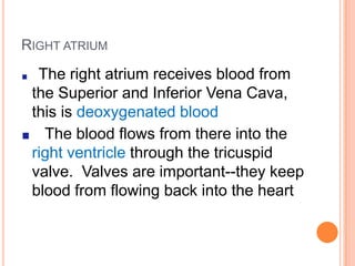 The heart is located in the mediastinum behind the sternum and consists of four chambers - the right and left atria which receive blood, and the right and left ventricles which pump blood out of the heart. It pumps deoxygenated blood to the lungs and oxygenated blood to the rest of the body through a one-way valve system, and has inner layers of epicardium, myocardium and endocardium.