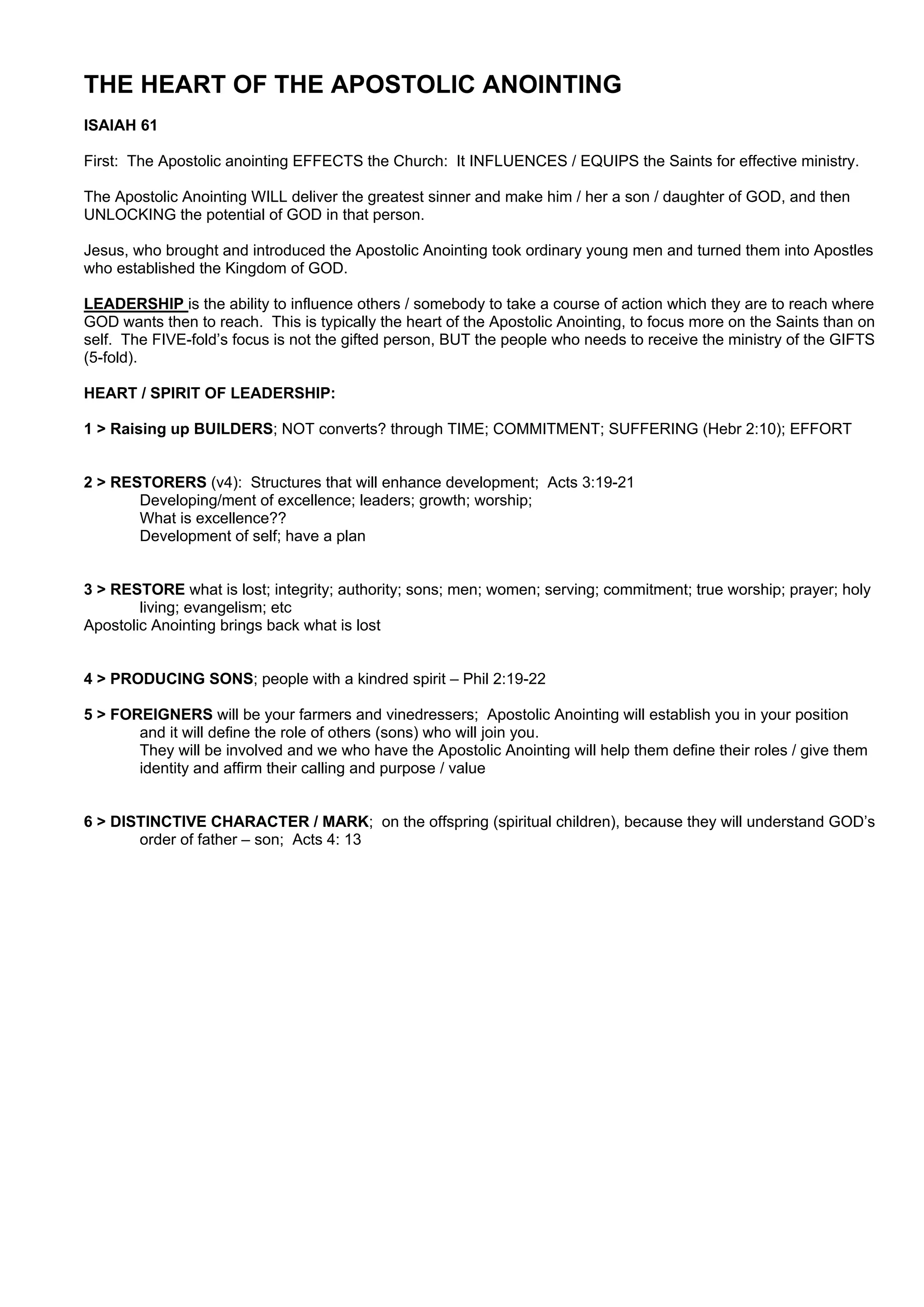 The document discusses the heart of the apostolic anointing. It states that the apostolic anointing: 1) equips and influences the church for effective ministry, 2) delivers the greatest sinner and unlocks God's potential in them, and 3) took ordinary men and turned them into apostles who established God's kingdom. The focus of the apostolic anointing is on helping the saints reach where God wants them, not on the gifted person. It raises up builders through commitment, suffering, and effort and restores what was lost like integrity, authority, and true worship.