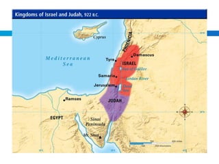 The document summarizes the history and beliefs of Judaism and the Hebrew people. It describes how Abraham was called by God to Canaan, and how the Hebrews/Israelites descended from Abraham. It then outlines the Israelites' enslavement in Egypt, liberation under Moses, receipt of the Ten Commandments from God at Mt. Sinai, conquest of Canaan under Joshua, and establishment of the kingdom of Israel with Saul and David as the first kings. It also discusses the division of Israel into two kingdoms after Solomon, conquest by Assyria and Babylon, and rule by foreign powers like Syria and Rome until the creation of Israel in modern times.