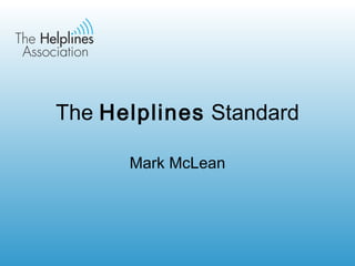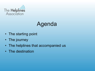 The document summarizes the development of a new helpline standard from its starting point, journey taken, helplines involved, and desired destination. It details consulting stakeholders to design a tool supporting sustainability in a multi-channel world. Feedback from pilot helplines was considered to create a standard accommodating multiple access channels, focusing on helpline-specific issues, and emphasizing strategic planning and responsible personal data use. The new standard and reduced assessment fee will be available in May.