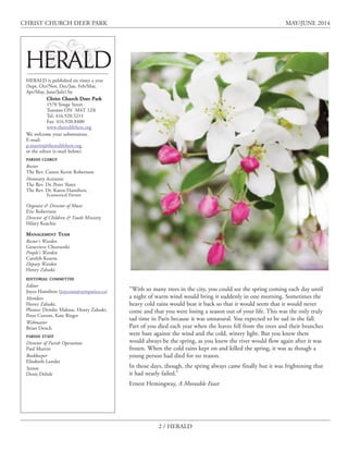 This document is the May/June 2014 issue of the Herald newsletter from Christ Church Deer Park in Toronto, Canada. It provides updates on events that took place at the church in the spring, including Lent and Easter activities for children and youth groups. It also profiles the church's Young Anglican Leaders program and their fundraising efforts. Other articles discuss a parishioner's trip to the Holy Land, a book club announcement, and reflections on the themes of liberation and slavery. The newsletter aims to keep the congregation informed about the life of the parish community.