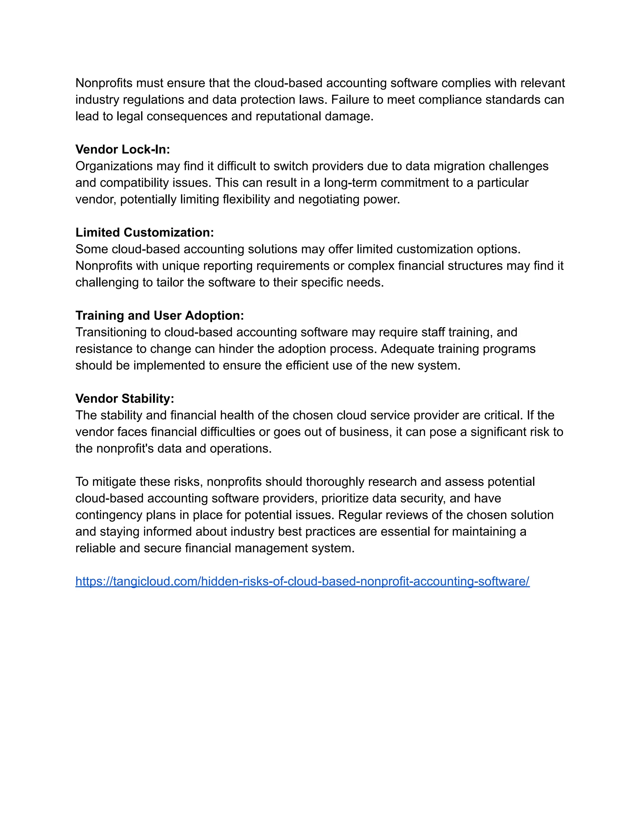 The document outlines the hidden risks associated with cloud-based nonprofit accounting software, emphasizing security concerns, data ownership issues, and potential downtime. It highlights the importance of understanding vendor stability, compliance regulations, and the need for careful analysis of costs and integration challenges. Nonprofits are advised to thoroughly research providers, implement training, and continuously review their chosen solutions to ensure financial security and operational effectiveness.
