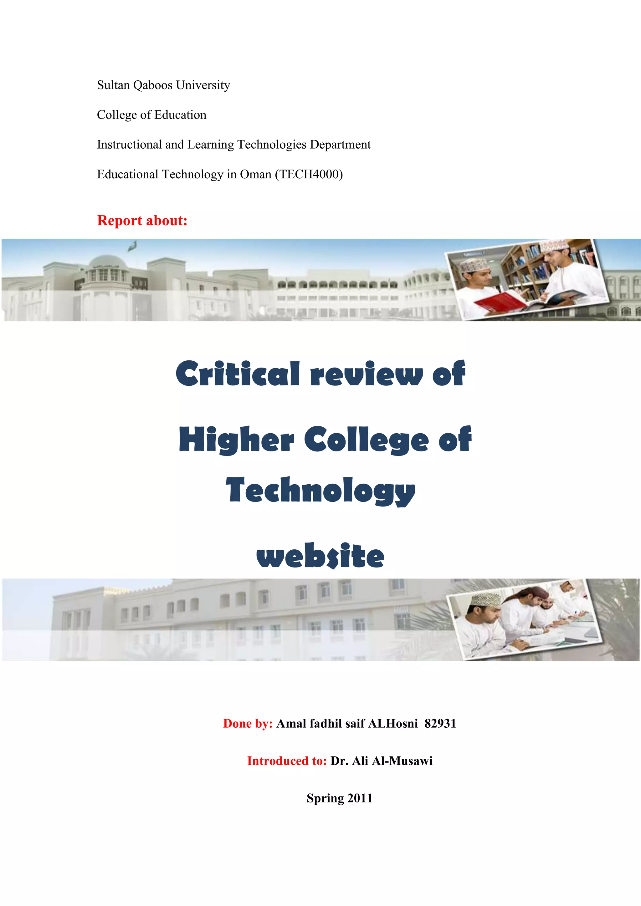The document is a critical review of the Higher College of Technology website. It evaluates different aspects of the website such as the writing process, web page creation skills, layout, navigation, and marketing. Overall, the review finds that the website is good but could be improved by focusing more on writing processes, font formatting, interactivity, and providing information about staff, courses, and research. It recommends adding more details to create a better user experience.
