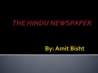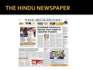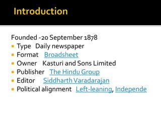 The Hindu is a daily newspaper founded in 1878 in Chennai, India. It is published by Kasturi & Sons Ltd. and has a daily circulation of over 1.4 million copies, making it one of the most widely read English-language newspapers in India. The newspaper was established to support a judicial campaign and counter British propaganda. It has historically had a left-leaning independent editorial stance. The Hindu publishes various weekly and monthly magazines covering topics like business, sports, science and more.