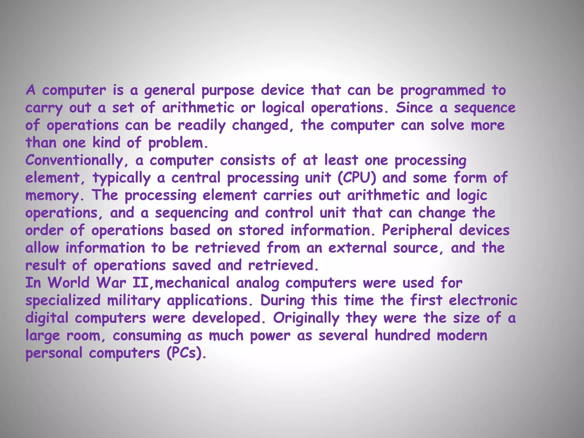 A computer is a programmable machine that can be instructed to perform arithmetic or logical operations. It responds to specific instructions in a defined manner and can execute a list of prerecorded instructions (a program). Conventionally, a computer consists of a central processing unit and some form of memory to store instructions and data, as well as peripheral devices to input and output information. Early computers were room-sized machines but modern computers integrated circuits make them millions of times more capable while occupying less space.