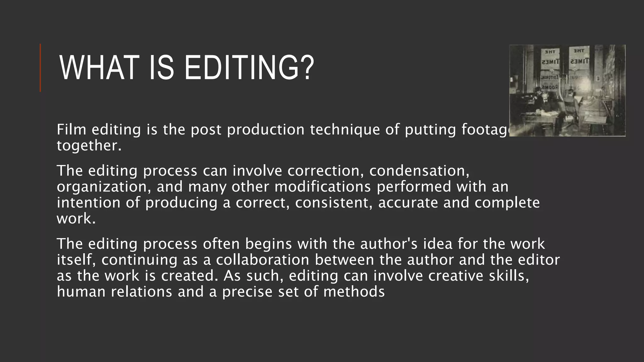 Film editing has evolved significantly from early films consisting of single static shots to complex techniques used today. Early editing established continuity by cutting between shots, while montage editing used techniques like jump cuts and superimposition. Soviet montage editing, pioneered by Eisenstein, used rapid cutting to imply meanings not literally shown. Hollywood developed continuity editing to seamlessly advance narratives. The French New Wave introduced long takes and existential themes. Sound editing began with The Jazz Singer, and technology advanced from flatbeds and Moviolas to non-linear digital systems.