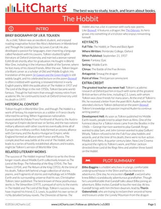 J.R.R. Tolkien wrote The Hobbit, which was published in 1937. As a child, Tolkien enjoyed imaginative fiction and invented languages. He fought in World War I and later became a renowned scholar at Oxford University. The Hobbit tells the story of Bilbo Baggins, a hobbit recruited for an adventure by the wizard Gandalf to help dwarves reclaim their homeland from the dragon Smaug. Bilbo discovers hidden talents and finds a magical ring of invisibility during the quest. The group faces many dangers from trolls, goblins, and spiders before finally confronting Smaug at the Lonely Mountain.