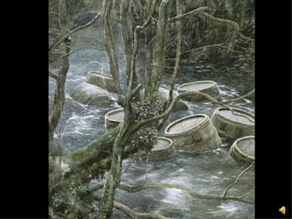 Bilbo discovered trapdoors hidden behind large barrels while exploring. The elves emptied the barrels and sent them through the trapdoors. The empty barrels were collected, tied together, and floated back to Lake-town on the river.