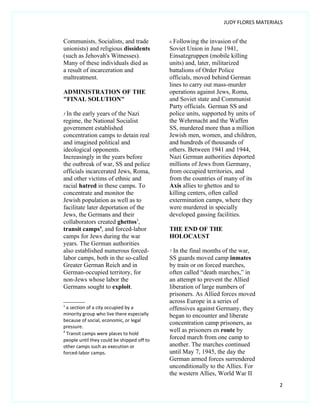 The Holocaust was the systematic state-sponsored persecution and murder of approximately six million Jews by the Nazi regime and its collaborators between 1933 and 1945. The Nazis also targeted other groups they deemed racially inferior like Roma, Slavs, the disabled, and homosexuals. By 1945, the Germans and their allies had killed nearly two out of every three European Jews as part of the "Final Solution." Concentration camps, ghettos, and forced labor camps were set up across Europe to imprison and exploit victims.