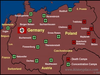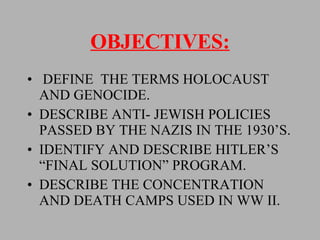 The document outlines key events and policies of the Holocaust. It begins with definitions of key terms and describes how Nazi policies against Jews escalated in the 1930s, restricting their rights and requiring identification with yellow stars. It then details the "Final Solution" planned at the 1942 Wannsee Conference, which sought to exterminate all 11 million European Jews. Death camps like Auschwitz, Treblinka and Sobibor were constructed for efficient mass murder using Zyklon B gas. Josef Mengele performed cruel medical experiments on prisoners. In total, approximately 6 million Jewish people were murdered in the Holocaust.
