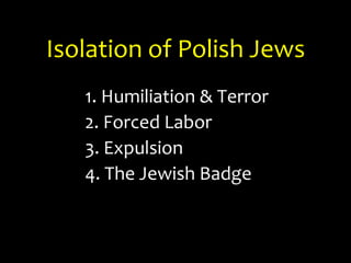 The document summarizes key events from 1939-1941 that led to the beginning of the Holocaust. It describes Hitler's racist ideology and Germany's invasion of Poland in 1939, which started WWII. It then details Germany's rapid conquest of Western European countries in 1940 through its "Blitzkrieg" tactics. The Nazis occupied these countries and quickly imposed anti-Jewish policies, including forced labor, property confiscation, and isolating Jews in ghettos. Over 800 ghettos were established in Eastern Europe by 1942, where Jews faced dire living conditions, forced labor, and eventual "liquidation." The document also outlines Germany's expansion eastward through alliances with Italy and Japan and invasion of the Soviet Union in