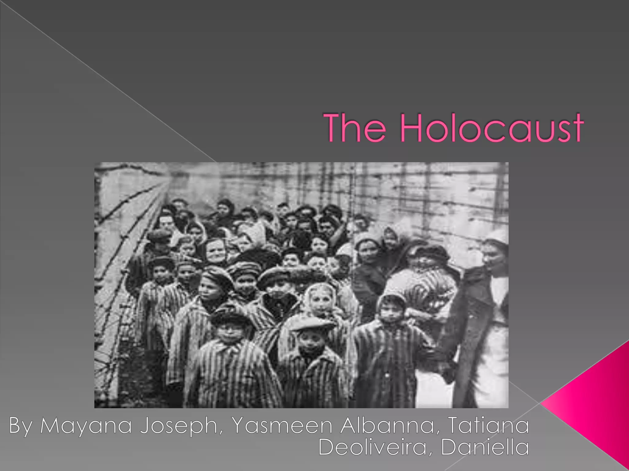The document summarizes the persecution and genocide of Jews by Nazi Germany during the Holocaust. It describes how Hitler rose to power in 1933 and made antisemitism official policy, severely restricting Jewish people's rights. It then outlines the escalating persecution through the 1930s including the Nuremberg Laws stripping Jews of citizenship. This culminated in the "Final Solution" planned at the 1942 Wannsee Conference, where the Nazis systematically murdered approximately 6 million Jews across Europe, most in death camps like Auschwitz where thousands were gassed and cremated daily. The Holocaust was a horrific crime against humanity.