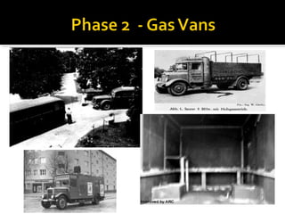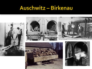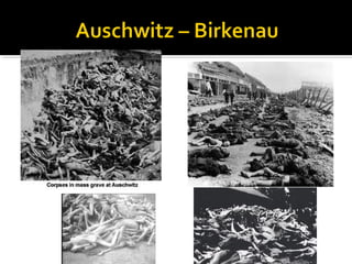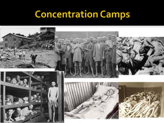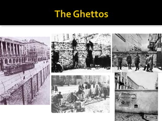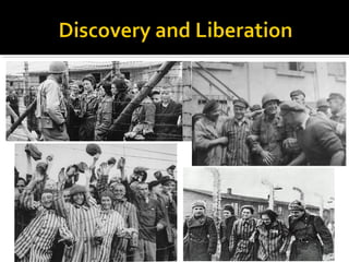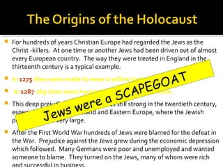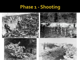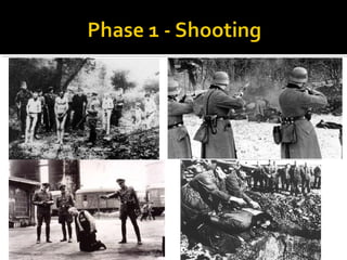 The document summarizes the persecution and genocide of Jews in Europe during the Holocaust. It describes how Jews had faced deep prejudice for centuries and were increasingly targeted in the early 20th century. The rise of Hitler and the Nazis led to the systematic oppression of Jews, stripping of their rights, and confinement to ghettos. The Nazis then implemented the "Final Solution" through concentration camps and death camps, where millions of Jews were executed through mass shootings, gas vans, and gas chambers. By the end, around 6 million Jewish people had been murdered by the Nazi regime during the Holocaust.