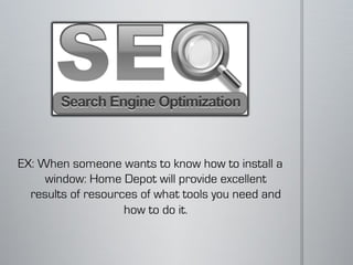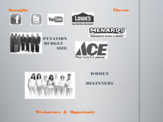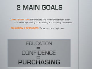 The document discusses Home Depot, the world's largest home improvement retailer with stores in all 50 US states and other locations. It identifies Home Depot's strengths as its reputation, budget, and size, while weaknesses include appealing to women and beginners. Opportunities include determining a budget, connecting with Target customers, creating resources, and measuring and improving marketing strategies for Christmas 2011.