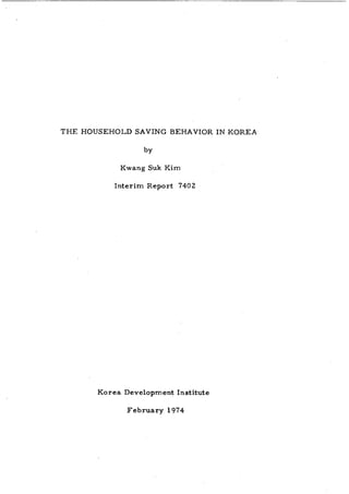 Title: The household saving behavior in Korea Material Type: Report Author: Kim, Wang Suk Publisher: Korea Development Institute Date: 1974-02 Series Title; No Interim Report / 7402 Pages: 79 Subject Country: South Korea (Asia and Pacific) Language: English File Type: Documents Original Format: pdf Subject: Economy; Macroeconomics Holding: KDI; KDI School of Public Policy and Management
