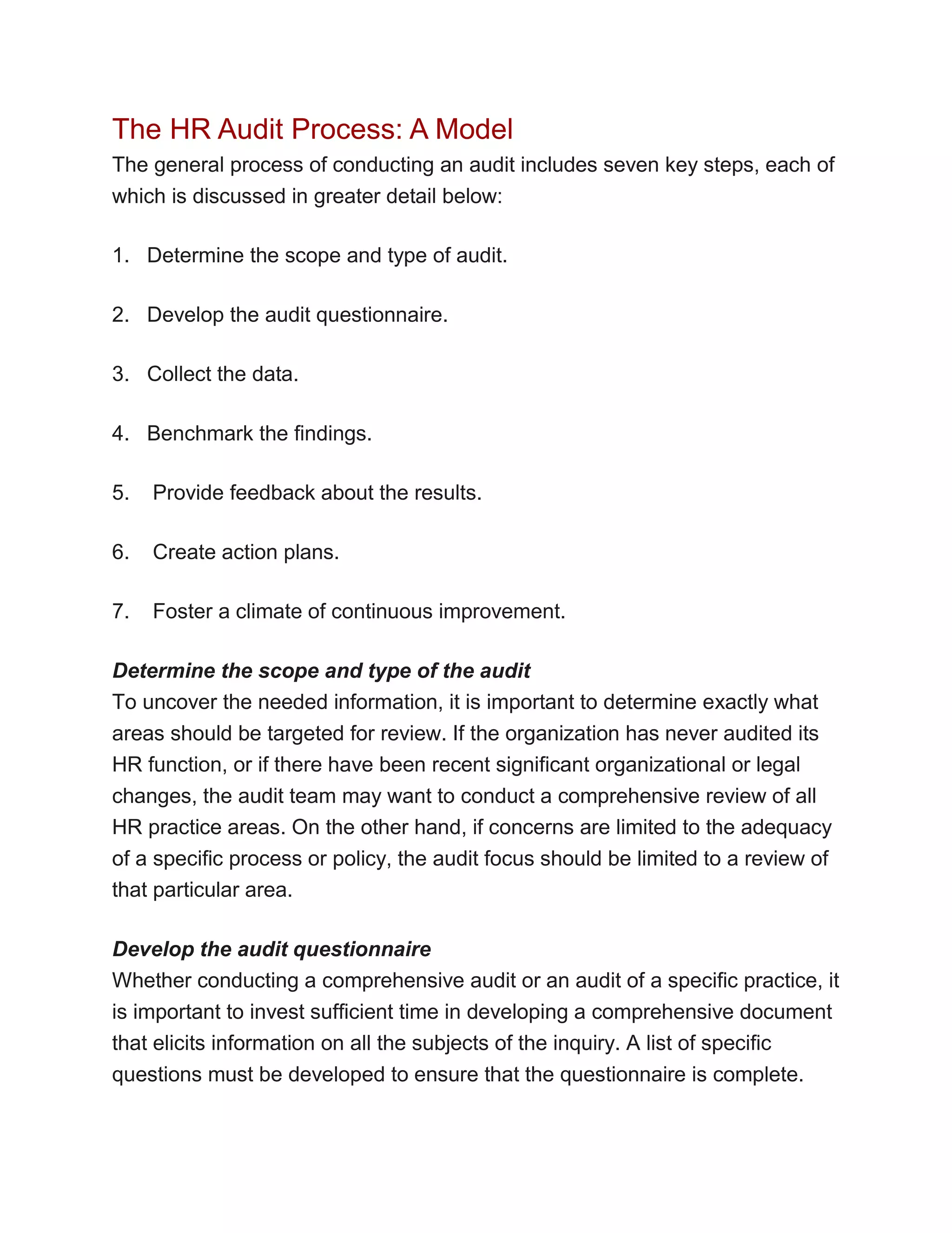The document outlines a 7-step model for conducting an HR audit: 1) Determine the scope and type of audit, 2) Develop an audit questionnaire, 3) Collect data using the questionnaire, 4) Benchmark findings against industry standards, 5) Provide a report of findings and recommendations to management, 6) Create action plans to address issues, and 7) Foster continuous improvement through ongoing monitoring and follow up. The goal of the audit is to assess HR practices, identify areas for improvement, and ensure policies and procedures are up-to-date and compliant on an ongoing basis.