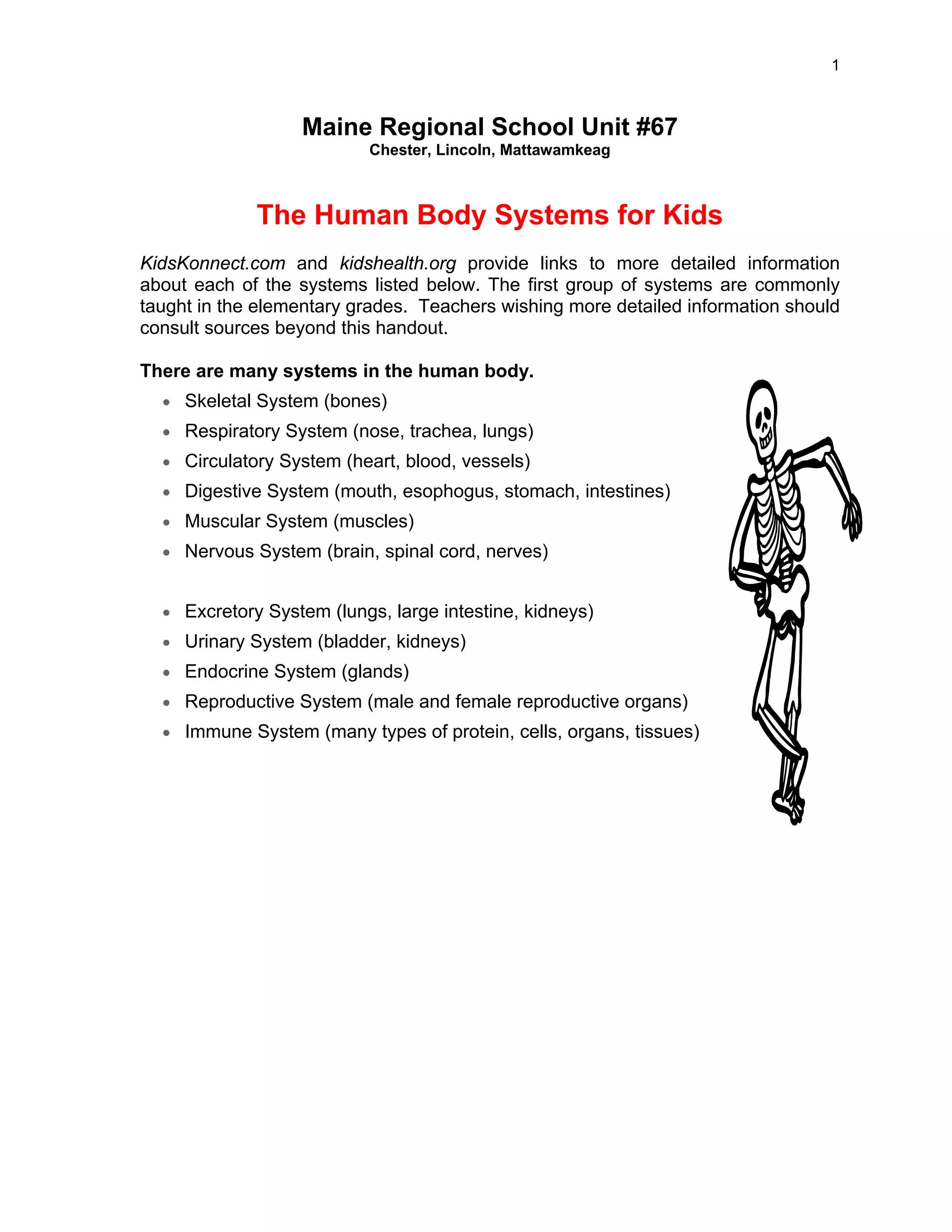 The document provides information on the major human body systems, including the skeletal, respiratory, circulatory, digestive, muscular and nervous systems. It gives brief descriptions of the basic structure and functions of each system. For example, it explains that the skeletal system protects organs and allows movement by attaching muscles to bones, while the respiratory system deals with breathing by taking in oxygen and removing carbon dioxide using the lungs. Links are provided for more detailed information on each system from kidshealth.org.