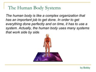 The human body contains several interconnected systems that work together to keep us alive and functioning. The circulatory system transports blood throughout the body via the heart and blood vessels, providing cells with oxygen and nutrients and removing waste. The respiratory system intakes oxygen and removes carbon dioxide through breathing. The digestive system breaks down food through the mouth, esophagus, stomach, and intestines and extracts nutrients for the body.