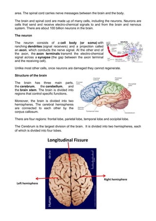 The human brain has three main parts - the cerebrum, cerebellum, and brain stem. The cerebrum is divided into two hemispheres and four lobes. Broca's area in the left frontal lobe controls speech production, while Wernicke's area in the left temporal lobe controls language comprehension. Damage to these areas can result in different types of aphasia. The brain is highly complex and not fully understood, controlling functions like thinking, movement, senses, and more.