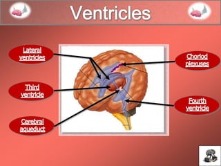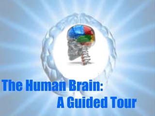 The document provides an overview of the major structures and functions of the human brain. It discusses the evolution of the brain from the reptilian to paleomammalian to neomammalian stages. It then describes the major parts of the cerebrum including the cerebral cortex, basal ganglia, ventricles, and meninges. Finally, it outlines several key functional areas of the cerebrum such as the motor, sensory, and language centers.
