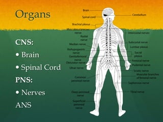 The document discusses the anatomy and physiology of the brain. It describes the main parts of the brain as the cerebrum, cerebellum, and brain stem. The cerebrum is the largest part and is divided into four lobes that control functions like movement, sensation, vision, and language. The cerebellum aids in movement coordination and balance. The brain stem consists of the midbrain, pons, and medulla, and controls vital functions like breathing and heart rate. Other parts discussed include the thalamus and hypothalamus, which regulate sensation and autonomic body processes respectively.