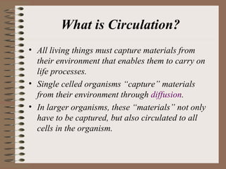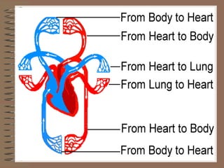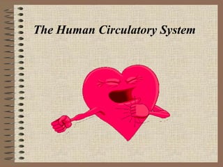 The human circulatory system transports oxygen, nutrients, hormones, and other materials throughout the body via blood flow in blood vessels. Blood is pumped from the heart through arteries and returns to the heart via veins. The circulatory system transports these materials to all cells in the body and picks up waste products, maintaining homeostasis. Diseases of the heart and blood vessels like atherosclerosis, hypertension, and heart attacks are leading causes of death in the US.