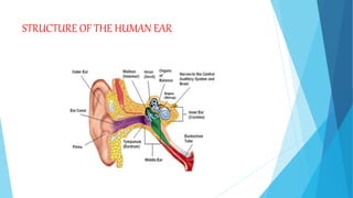 The human ear has three parts - the outer, middle, and inner ear. Sound travels through the outer ear and vibrates the eardrum, causing the middle ear bones to vibrate as well. This movement is transferred to the inner ear, where fluid causes hair cells to bend and send signals through the auditory nerve to the brain for interpretation as sound.