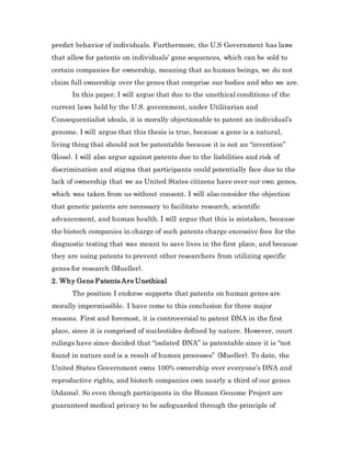 The document discusses the ethical controversies surrounding the Human Genome Project, particularly regarding the patenting of human genes. It argues that the current U.S. laws on gene patents infringe on individual ownership of genetic material and pose risks of privacy violations and discrimination. The author contends that gene patents hinder scientific progress and that genetic information should not be considered a commodity but rather a public domain for the betterment of human health.