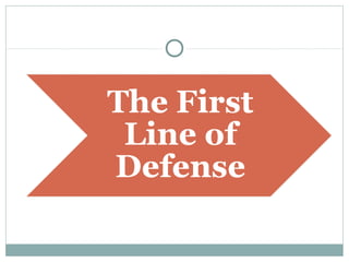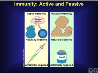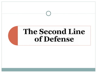 3. When pathogens breach these defenses, the body responds through inflammation, antibodies, and specialized immune cells like phagocytes, natural killer cells, and T cells that destroy infected cells. Immunity can be active from exposure or passive from antibodies transferred from mother to child.