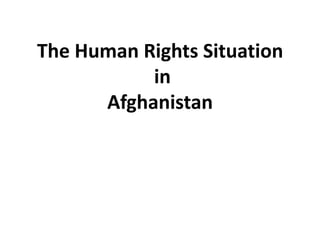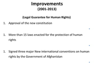 The document summarizes the human rights situation in Afghanistan between 2001-2013. It outlines improvements such as the approval of a new constitution, new laws protecting human rights, and signing international conventions. However, it also notes ongoing challenges including insecurity, violence against women, and weak rule of law. Civilian casualties remain high with over 3,000 killed or injured in the first eight months of 2013 alone. The Afghanistan Independent Human Rights Commission was created and has helped increase public awareness, but illegal armed groups and lack of access to justice in remote areas continue to be problems.