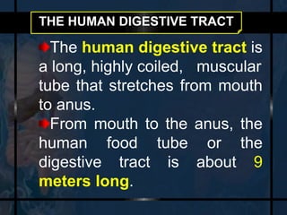 The human digestive system is made up of a long digestive tract that stretches from the mouth to the anus. Food is broken down mechanically and chemically by different organs along the tract. Mechanical digestion begins in the mouth by teeth. Chemical digestion starts in the mouth by saliva and continues in the stomach by gastric juices and in the small intestine by enzymes from the pancreas, liver, and intestinal walls. Nutrients are absorbed in the small intestine and undigested waste is eliminated in the large intestine and anus. Proper digestion relies on balanced diet, chewing, drinking water, and exercise.