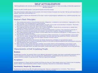 The Humanistic Approach developed in the 1950s and focuses on people's capacity for self-actualization. It views humans as inherently good with free will and an ability to shape their own destiny. Key figures like Maslow and Rogers believed psychology should study healthy individuals and their subjective experiences rather than focus on mental illness. Maslow developed a hierarchy of needs and Rogers created person-centered therapy to help people overcome issues blocking their self-actualization.