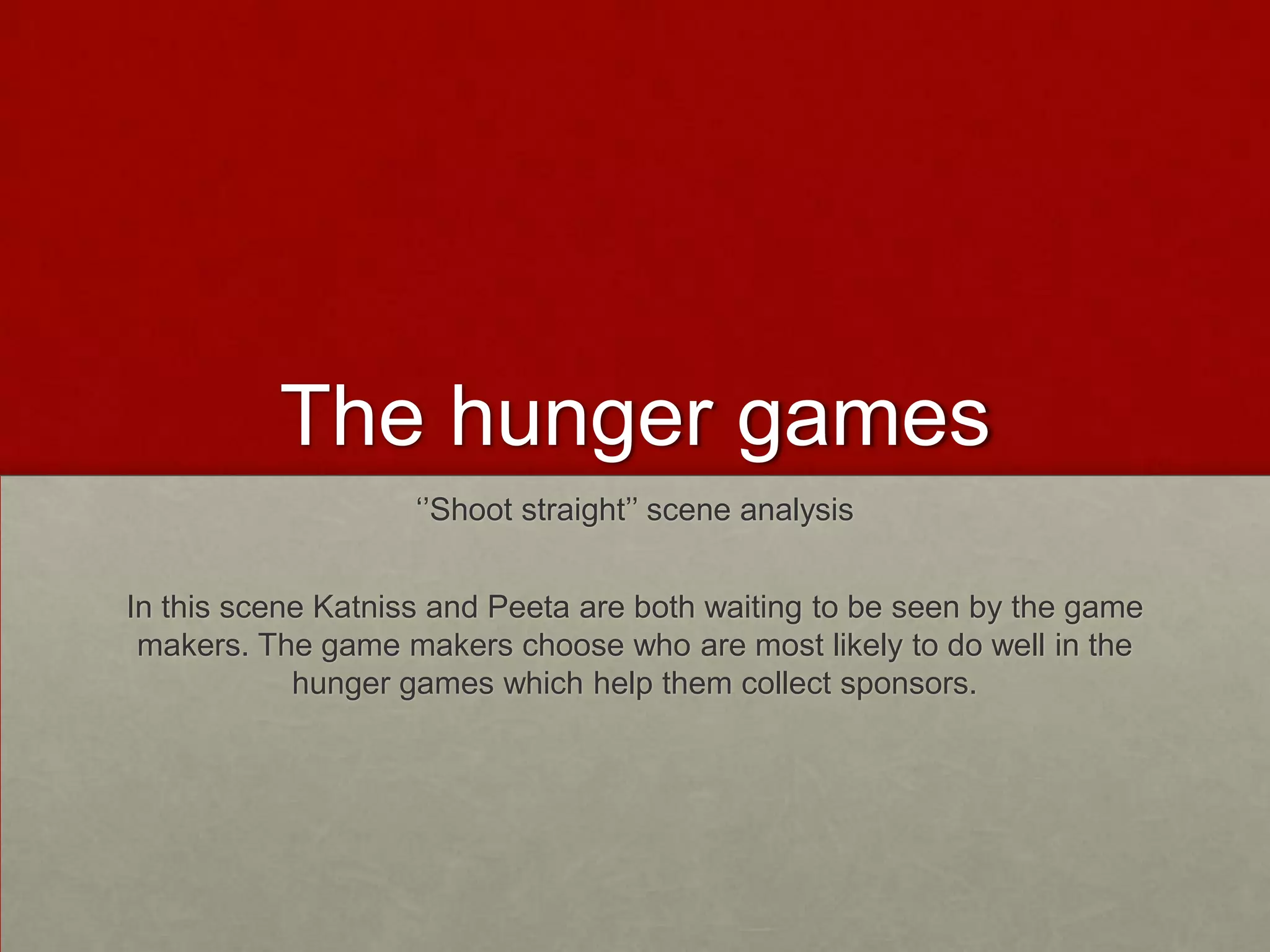 Katniss and Peeta are waiting to be evaluated by the game makers in a dark, prison-like room. The setting uses lighting, metal bars, and spotlights to create an interrogative atmosphere and emphasize that Katniss feels confined and trapped. Their matching uniforms suggest they have to follow rules that limit their power. Seneca Crane watches menacingly in red and black, symbolizing his threat. The empty sound when Katniss hits her target, and the game makers' joking, show they are not taking the evaluation seriously.