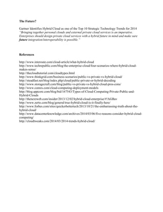 The document discusses hybrid cloud computing, which combines private and public clouds to offer cost-effective solutions, disaster recovery, and seamless application integration. It highlights the benefits of hybrid cloud, including enhanced security, improved access, and efficient resource management amidst varying computing demands. The author emphasizes the importance of considering hybrid setups in future IT strategies, as identified by Gartner as a key technology trend.