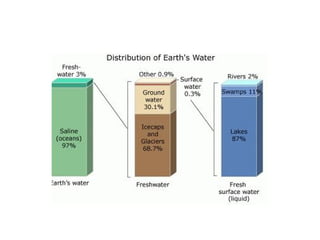 The document discusses the water cycle and distribution of water on Earth. It begins by asking several questions about water on Earth. It then explains that the majority of Earth's water is contained in oceans as saltwater, while the majority of freshwater is stored as icebergs and glaciers. It provides an overview of the water cycle, including evaporation, transpiration, condensation, precipitation, infiltration, saturation, groundwater, and surface runoff. It concludes by discussing the residence time of water in different sources like the atmosphere, soil, groundwater, glaciers, and oceans.