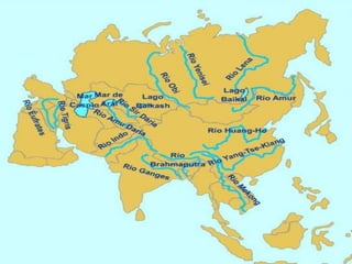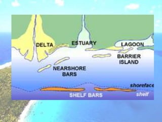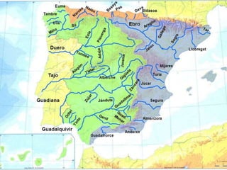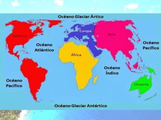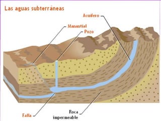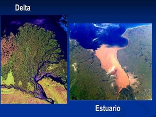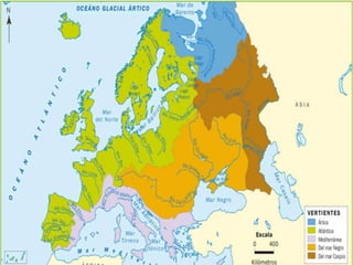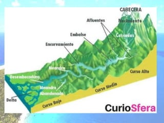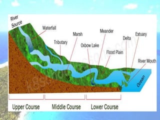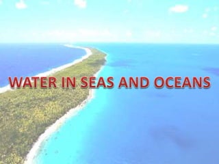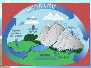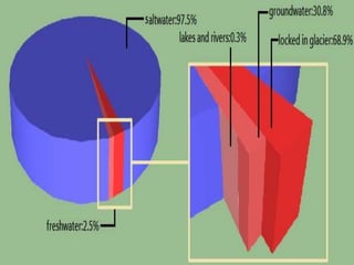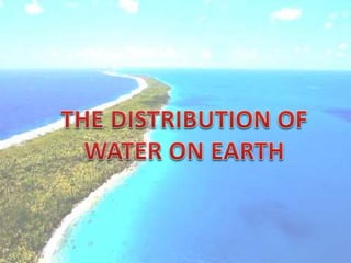 The document discusses the hydrosphere and water cycle on Earth. It describes how water circulates between the oceans, atmosphere, and land via evaporation, condensation, and precipitation in the water cycle. It provides details on the distribution of water on Earth, including that 97.5% is salt water in oceans and seas while the remaining 2.5% is fresh water in ice caps, glaciers, inland water, and groundwater. Rivers, lakes, and oceans are described along with their characteristics and locations.