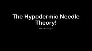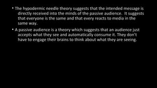 The hypodermic needle theory suggests that media messages are directly absorbed by a passive audience, impacting everyone uniformly. It posits that audiences uncritically accept media without engaging mentally. Music is cited as exemplifying this theory since it can be consumed passively. Advertisers leverage the theory by using music to make ads, films, and products more memorable through repeated exposure. The author plans to apply the theory in their magazine by including light, undemanding content that doesn't require critical thought.