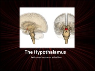 The hypothalamus is a small area of the brain that controls crucial bodily functions such as metabolism, homeostasis, hunger, thirst, emotions, temperature regulation, sleep cycles, and the pituitary gland. It carries out these functions by coordinating the autonomic nervous system and endocrine system. Studies have shown that exercise can restore sensitivity of neurons involved in satiety, reducing food intake and weight. The hypothalamus, not the amygdala, may control fear responses based on a study where lesions to the hypothalamus eliminated fear in mice. Dysfunctions can cause issues with sleep, hormones, immune function, autonomic function, temperature, and more.