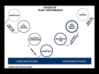 The document provides guidance for team leaders on developing high-performing teams. It outlines key stages in team development including orientation, trust-building, goal clarification, commitment, implementation, and high performance. For each stage, it describes what members need and provides scenarios of how meetings could go well or poorly. It also provides standards for key aspects of managing a team such as creating a team identity, developing a plan, writing job descriptions, providing training, tracking performance, coaching members, and facilitating evaluation and reflection. The document is a resource for team leaders to understand how to guide their teams through different stages and ensure the components of effective team management are in place.