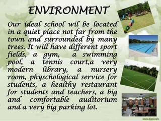 The document outlines the ideal features of a school according to its authors. It would be located in a quiet natural setting near town, with various sports facilities and a modern library. Classrooms would have the latest technology and a maximum of 20 students per class to ensure individual attention. Both students and teachers would uphold values of respect and friendship. Teachers would receive ongoing training and make classes engaging using technology. The school aims to develop well-rounded students through extracurricular activities and a manageable workload for educators.