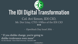 The document discusses the Israeli Defense Forces' (IDF) digital transformation strategy, highlighting past failures in leveraging digital advancements and the need for an effective multi-year digital strategy. Key initiatives include the implementation of cloud computing, open-source technologies, and real-time operational intelligence to enhance mission capabilities. The IDF seeks to navigate changes in technology while building partnerships with the open-source community and redefining its operational framework.