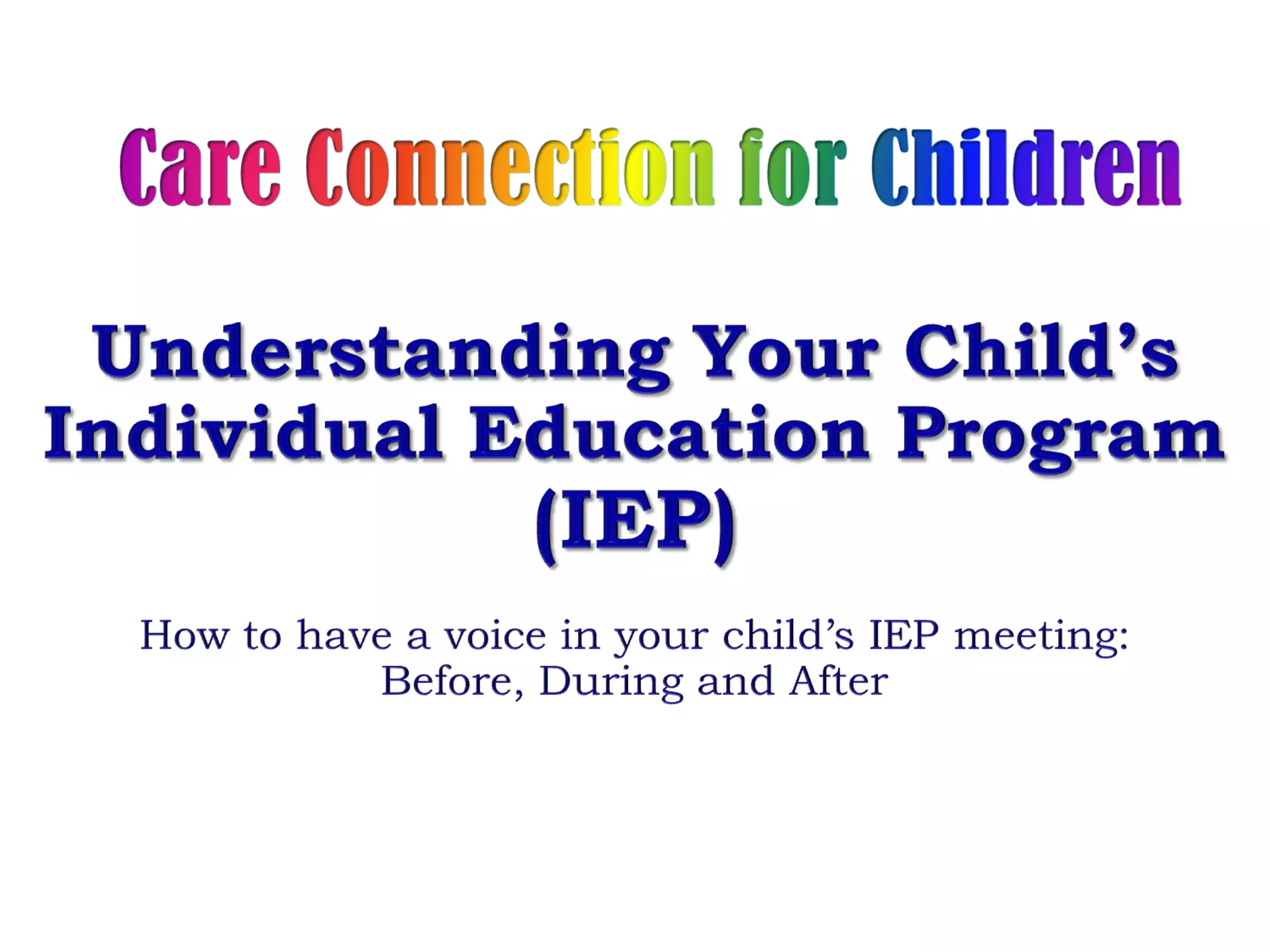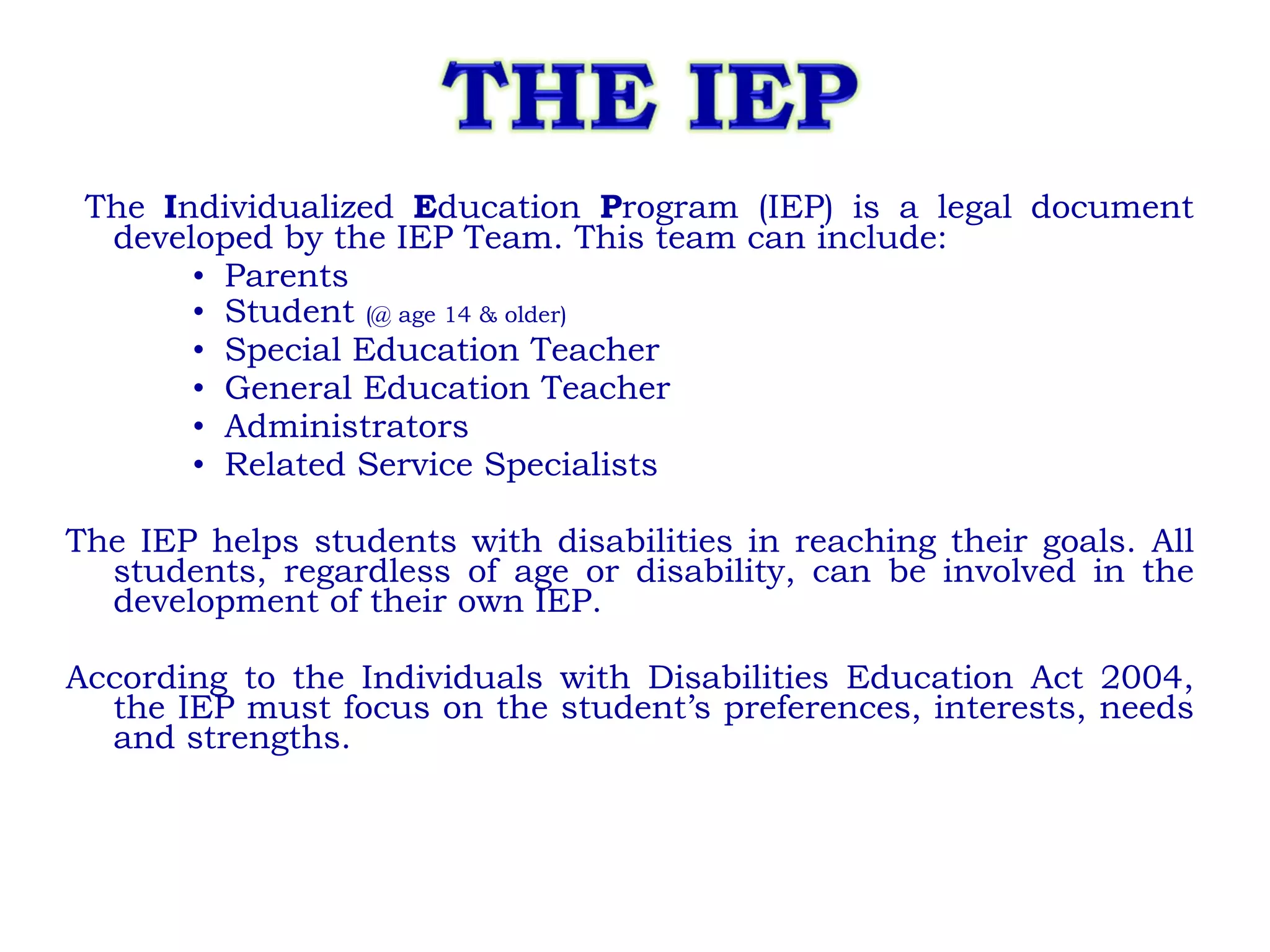 The Individualized Education Program (IEP) is a legal document developed by a team to help students with disabilities reach their goals. The IEP focuses on the student's preferences, interests, needs, and strengths. A new IEP is written at least every 12 months. Parents are equal partners on the IEP team and should provide input on their child's abilities and needs. The IEP outlines the student's current performance, annual goals, related services, accommodations, and placement.