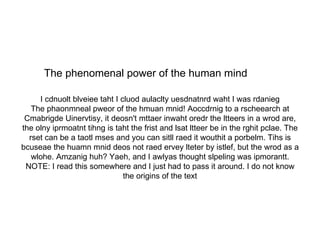The human brain has an amazing ability to recognize patterns and make sense of written language even when letters are out of order or misspelled. Our brains do not process each individual letter but recognize words holistically. Optical illusions can confuse our eyes and brains by exploiting visual phenomena like motion perception and afterimages.